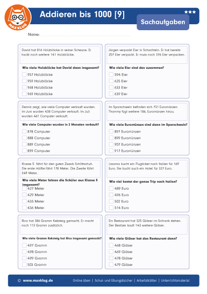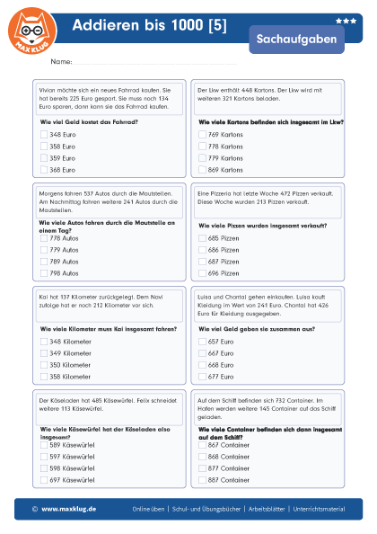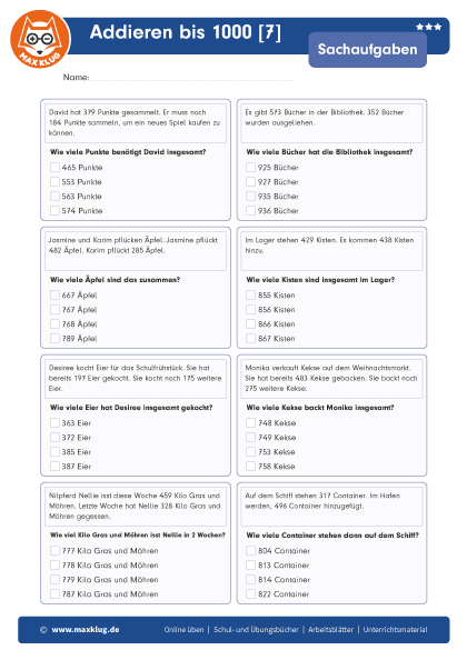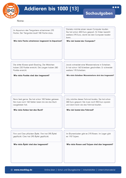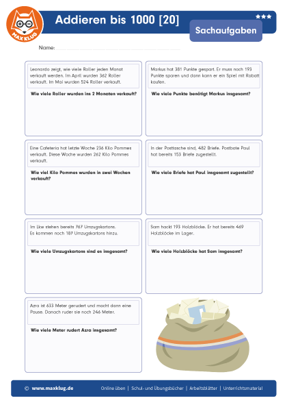 Arbeitsblätter > Sachaufgaben > Addieren > Bis 1 000