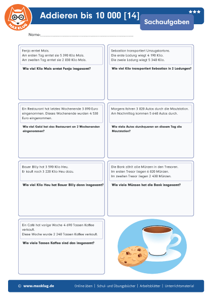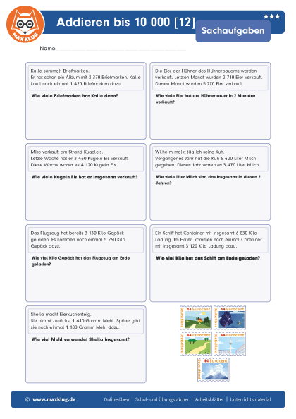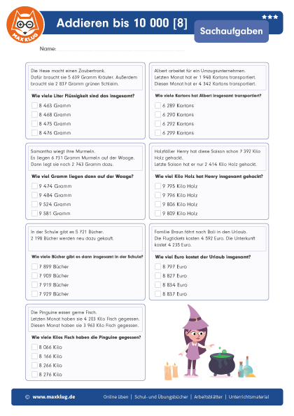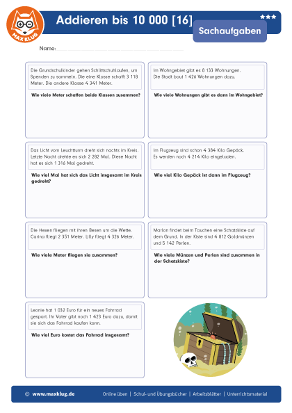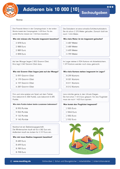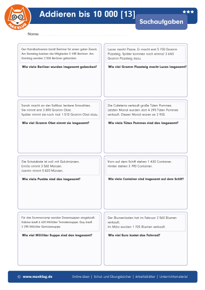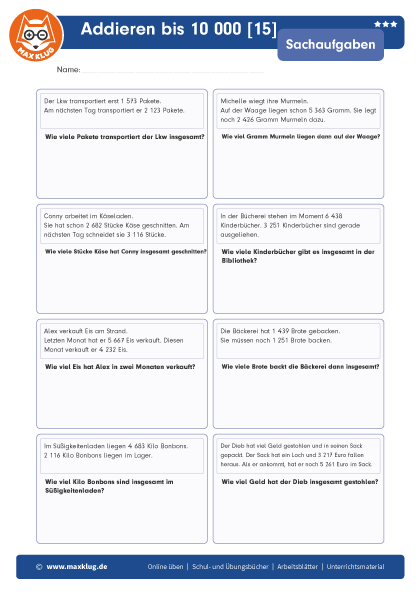 Arbeitsblätter > Sachaufgaben > Addieren > Bis 10 000