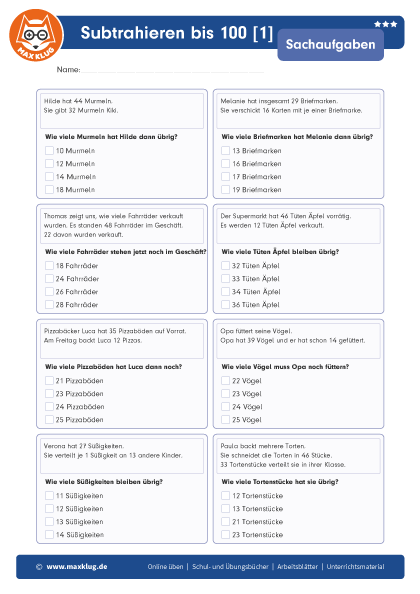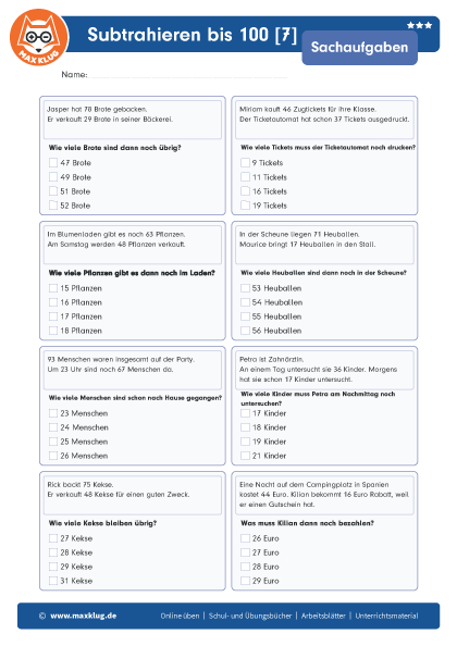 Arbeitsblätter > Sachaufgaben > Subtrahieren > bis 100