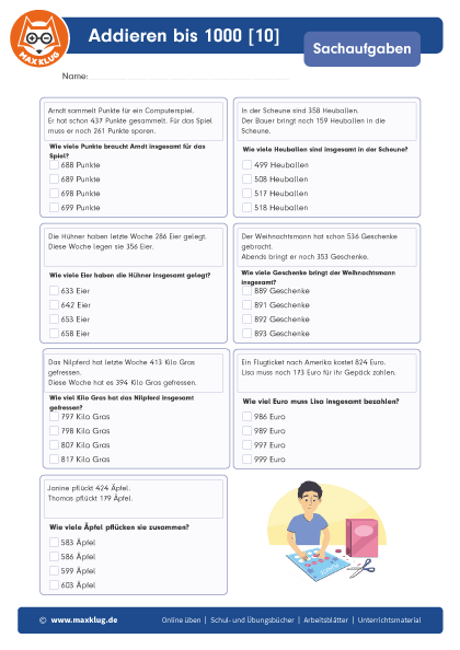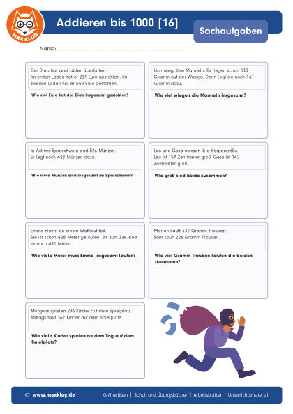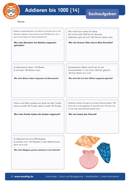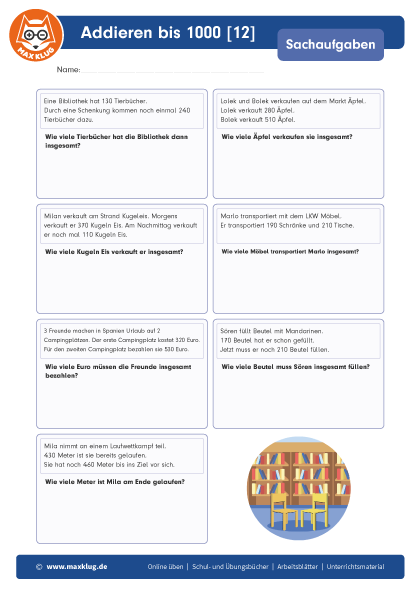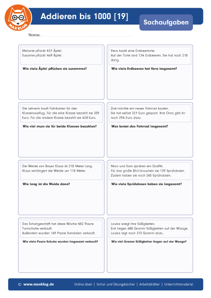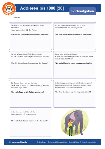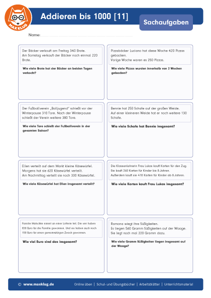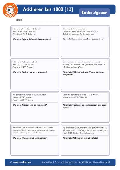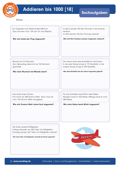 Arbeitsblätter > Sachaufgaben > Addieren > Bis 1 000